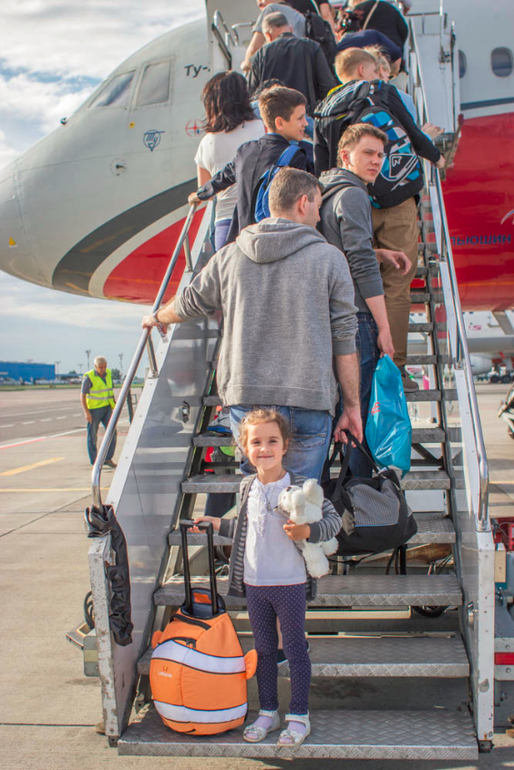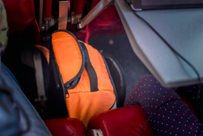 в самолете отлично поместился между креслами. И наконец то мне не нужно набивать свою сумку раскрасками, игрушками, едой и прочими вещами для нее) пусть сама теперь возит )