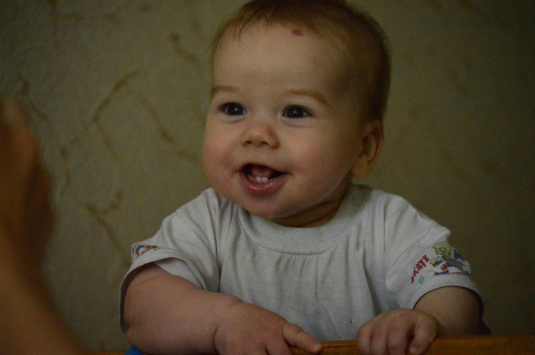 парень общительный,улыбается всем,ко всем идет на руки!но самый лучший для него-это старший брат,только увидит и сразу визжать начинает))