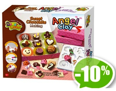 Состав: легкая глина 30гр.х1 (шоколадная), 12гр.х2 (белая), 4гр.х3 (красная, желтая, розовая), инструмент, коробочка и обертки для конфет, формочки для лепки пирожных, инструкция