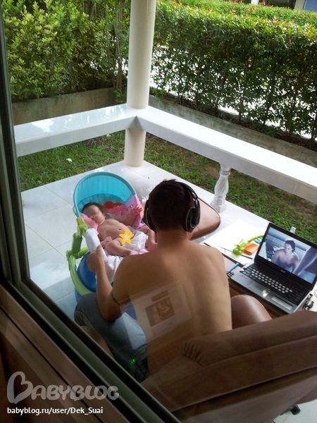 У нас папа в силу своей тяги к компьютеру находит различные способы укачивания сына. Недавно нашёлся новый эффективный способ. Он берёт сынулю, кладёт в шезлонг, шезлонг помещает на фитболе и вуаля готово, осталось только качать. Сына быстро успокаивается и засыпает.