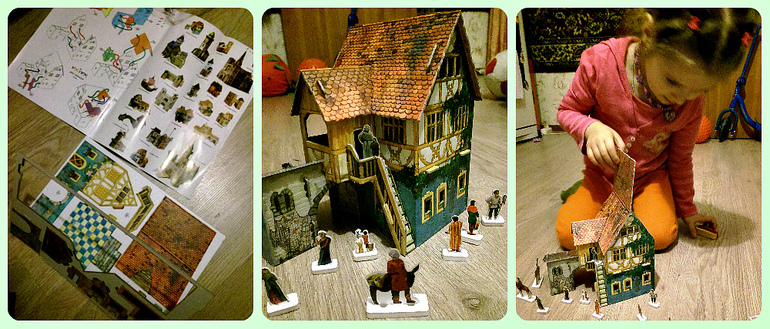 Папа принялся собирать сборный домик из картона. Кристине он тоже очень понравился и она с ним с удовольствием играет. Там открывается крыша и одна сторона домика, чтобы можно было заглянуть во внутрь, а еще там фигурки людей)))