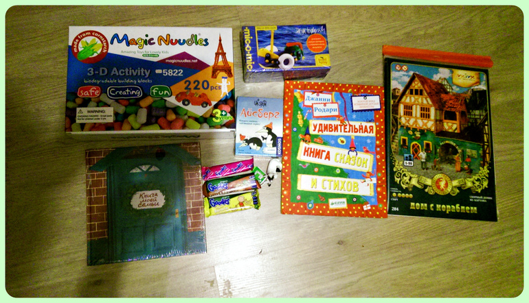Большую книгу сказок, Книга моей семьи для самостоятельного заполнения, батончики фруктовые - Кристику не понравились, фигурка животного - овечка, конструктор кукурузный и игру Айсберг мы пока не открывали, отложили на потом