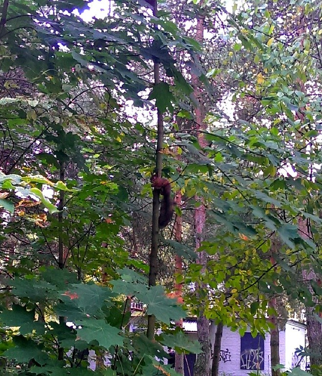 Она покружила возле нас, попрыгала по деревьям. Потом прибежала кошка, и белочка убежала.