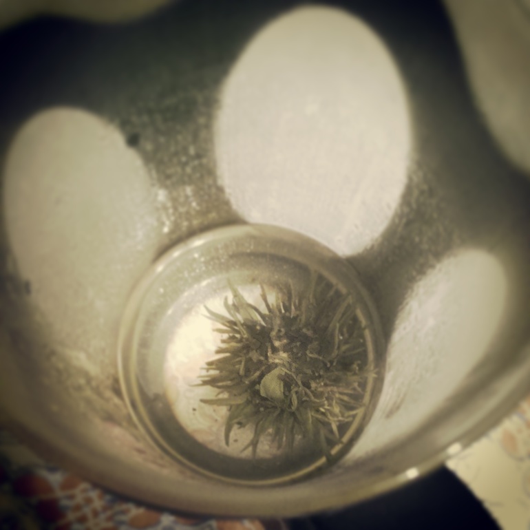 Наверно год назад покупала набор зеленого жасминового чая. Решила заварить "Жасминовый венок". На вид был не большой бутон и вот что получилось)))