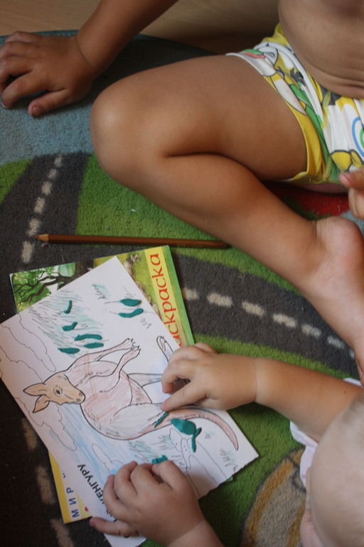 Рома сразу подключился и стал отбирать у меня карандаши. Потом, когда он забрал все 4 зеленых карандаша и вставил себе между пальцев на ногах, я взяла пластилин и стала кормить кенгуру травкой.