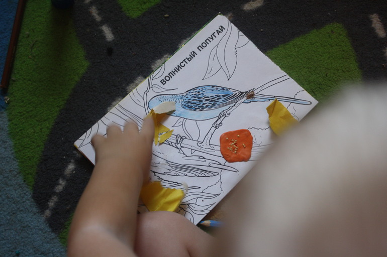 На радостях мы перевернули листок, раскрасили и покормили волнистых попугаев пшеном с личинками. Что в пшене что-то живое есть, я обнаружила не сразу. А потом до меня дошло, от куда у меня опять порхают мотыльки-моли или кто они эти мини-бабочки, которые заводятся в продуктах...