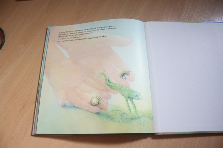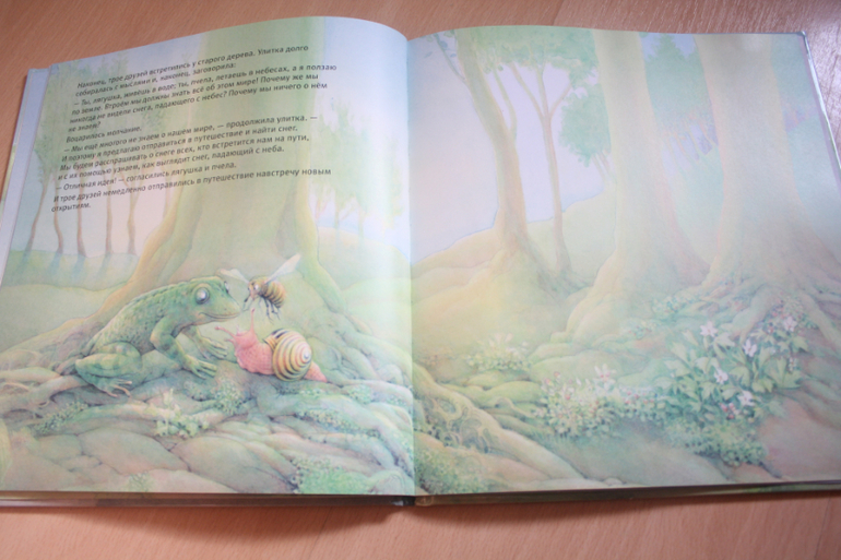 Главные герои улитка, лягушка и пчела - соответственно. Пока они пытаюсь понять, что же такое снег, весну сменяет лето, а лето осень. В итоге любопытные создания приходят к намеченной цели, но чуть было не погибли из-за этого по понятным причинам. Но все закончилось благополучно, к счастью. Добрая история с добрыми картинками