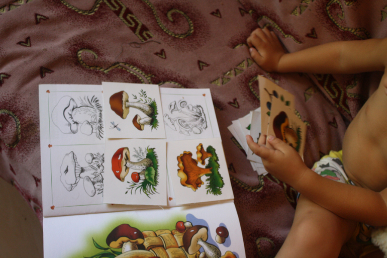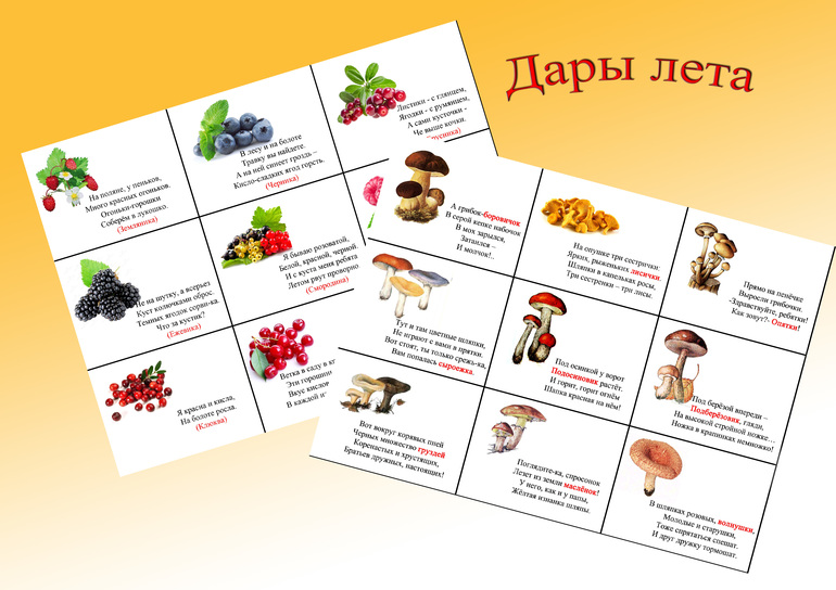На карточках с ягодами загадки, на карточках с грибами стихи.