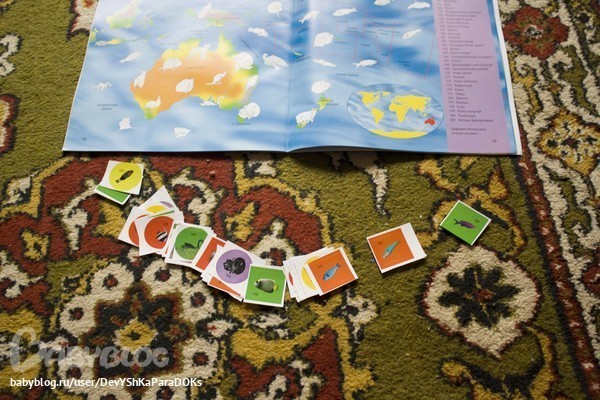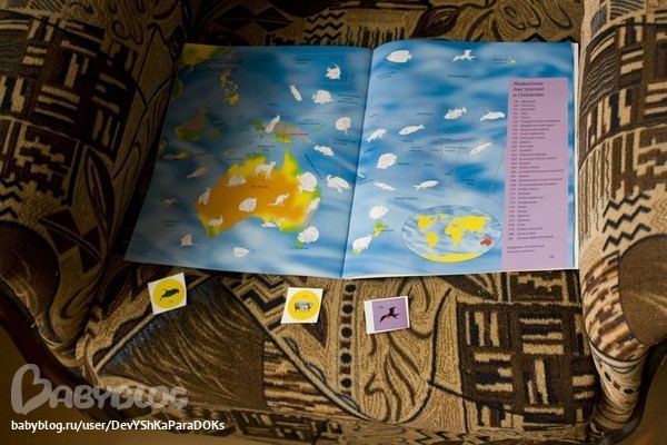 Вот это весчь!!!! Атлас! Как раз для нас! Но наклейки в беспорядке сложены, я их разрезала, сегодня выдала Австралийских животных (точнее по дому разбросала, а Д/имка находил). Остыл как-то к наклейкам, больше дурачился, чем клеил! Но мне нравится!
