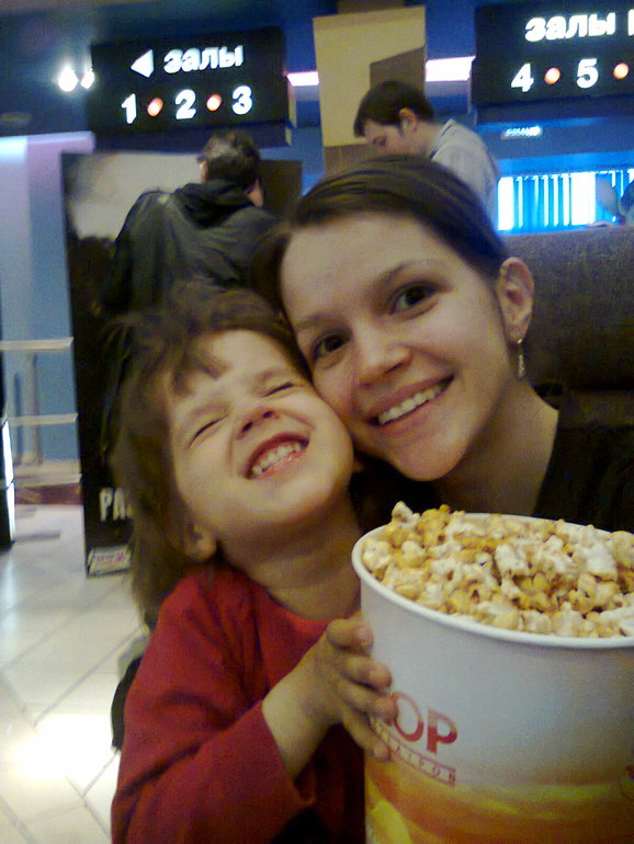 первый раз был удачный, Сашка досидела до конца, поклевала поп-корн и вышла счастливая, жаль, что мультиков нашего возраста очень мало в прокате((