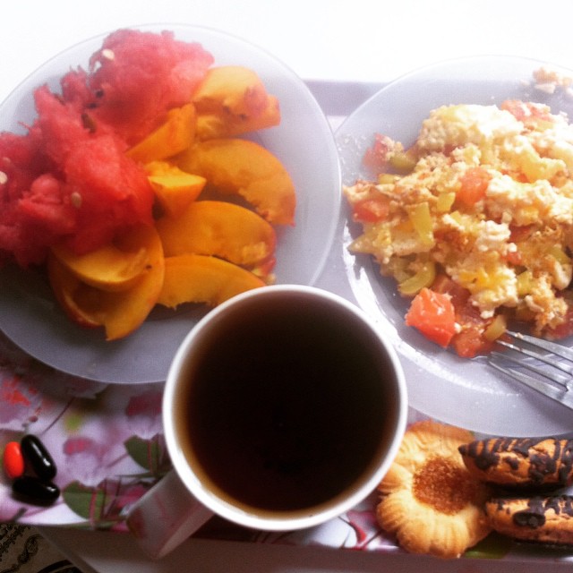 кулинария#завтрак #меню #пп Омлет с овощами, я его готовлю,как в Турции. Кидаю на сковородку овощи и сразу заливаю яйцом, так они остаются сочными и хрустящими. Арбуз+персик.Омега+ поливитамины. Черный чай с мятой. Печеньки