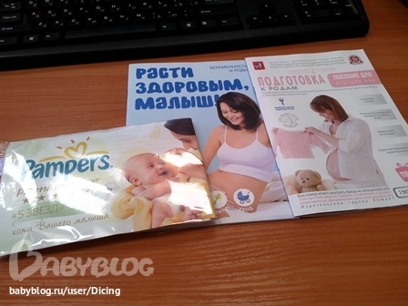 А еще нам дали подарок))) 2 книжечки и памперс для новорожденных. Это первая вещь для моего малыша и только увидев его я ощутила, что у меня будет ребенок. До этого мне казалось, что все что со мной происходит это не со мной. Ну да, живот, ну врачи, анализы, пиночки... Казалось, что я просто за кем-то наблюдаю со стороны. А сейчас прям осенило...