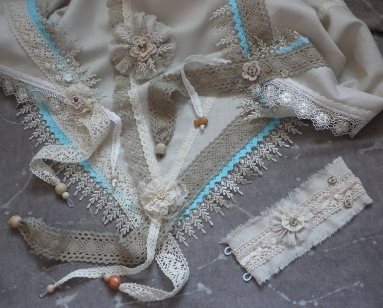 В этот раз сотворился комплект: платок,брошь и браслет. Из натурального льна с использованием более 10 видов кружева- от тяжёлого льняного до невесомого гипюра...
