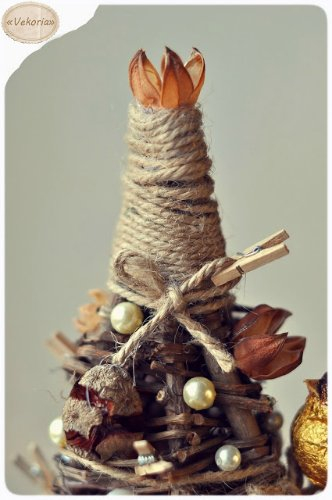 Созданную таким образом ёлку декорируем различным природным материалом - орехами, шишками, желудями, палочками корицы и прочим.