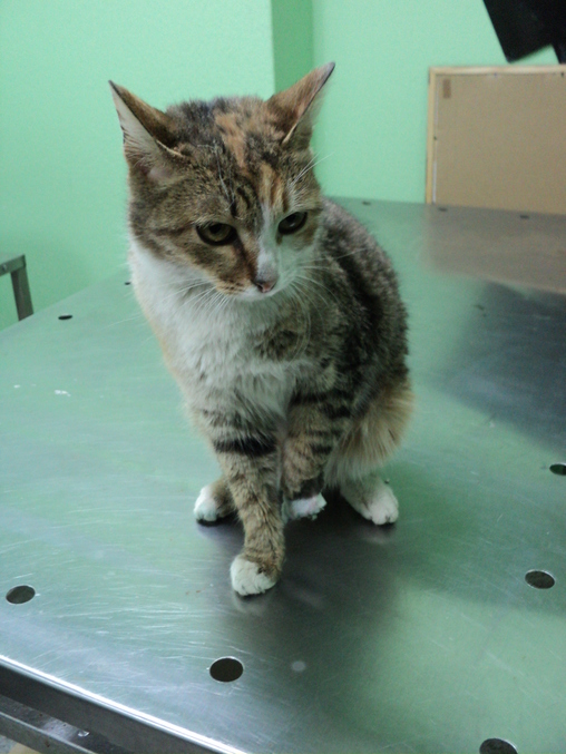 16 февраля, в субботу муж во дворе подобрал трехцветного котенка (ему на вид чуть больше года). Это девочка. Кошечка не могла наступать на левую переднюю лапку. У котенка была ранка на лапке. Видно было, что даже висит кусочек (где растут ноготочки). В тот же день отвезли ее в клинику «Шесть слонов» на Гвардейской. При осмотре обнаружилось, что это обморожение и у нее уже началась гангрена. Сделали ей операцию. Хорошо, что муж заметил ее вовремя, так как еще немного и в результате гангрены, котенок мог лишиться всей лапки… И мог бы передвигаться только на трех… Сейчас она находится на лечении в той же клинике. До субботы, а потом необходимо будет искать ей передержку или новых хозяев. Также до субботы ей будут обрабатывать швы, чистить от блох и глистов. Очень милая, ласковая и симпатичная девочка! Давайте поможем найти ей Дом!