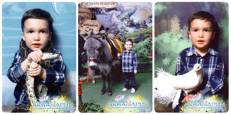 После окончания "проката" мы пошли смотреть, что там есть еще (пришли примерно за час до начала, т.к. там много развлекухи в фойе). И тут мой упрямый барашек вдруг закатил такуууую истерику на тему "хочу еще на паровозик, не хочу водить хороводы и танцевать, уже ваще ничего не хочу, пошли домой!!!" Я была в шоке, честно говоря, т.к. истерики у нас, конечно, бывают, но в театры-цирки и прочие развлекухи мелкий всегда ходит с удовольствием. Минут через 15 рева и попыток хоть на что-нибудь отвлечь, уговорился пофоткаться с животными (там в фойе через каждые 2 метра с кем-нибудь фоткали). Причем, после осмотра всего ассортимента ("а можно всех посмотреть?") выбрал вот ЭТО! Я честно предлагала сфоткаться с собачкой, на что мелкий сказал "Нет, хочу со змеей"))) Питон, кстати, для него тяжеловат немного, поэтому заяц на фото такой пришибленный (да еще и зареванный после истерики). А перед фото с голубем минут 5, пока ждали, тренировался держать ручки (чтобы голубя на ладошки посадили).