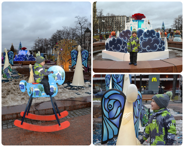 Встретили Деда мороза (был праздник для какой-то школы, Дед Мороз с ними приехал), мелкий за ним носился, танцевал (Дед заводной оказался), еле от него увела. На Тверском бульваре куча разных снеговиков, лошадок вот таких, фотовыставки старых открыток и т.д.