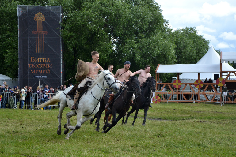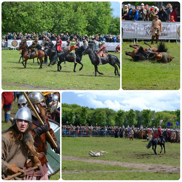 Потом еще были конные состязания, когда нужно было тремя видами оружия (копье, сулица и меч), поразить разные мишени. Сначала копьем нужно было снять кольцо со стойки, потом этим же копьем поразить цель внизу - мешок, потом на ходу вытащить из земли сулицу - небольшое легкое копье (несколько штук были воткнуты по ходу движения), и попасть в мишень, потом развернувшись, нужно было мечом сбить яблоко или капусту, которые были наколоты на колья (а капусту нужно было рубить еще и в прыжке через препятствие).