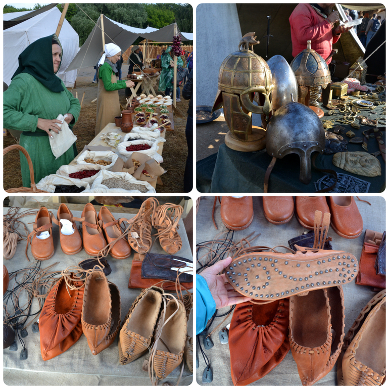 На торжище продавали всякие изделия - украшения, шлемы, обувь и даже ткани - все сделано по технологиям древних славян. Также там в отдельных палатках ремесленников можно было посмотреть, как делали различные изделия.