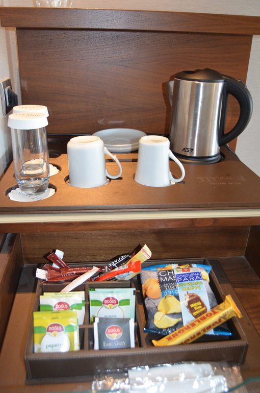 В номере: махровые халаты, тапочки, чайник, минибар.