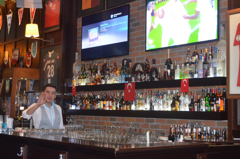 Алкоголь в баре импортный. Шампанское сухое и полусладкое,виски, водка, коньяк, пиво, вино розовое, красное, белое, коктейли)