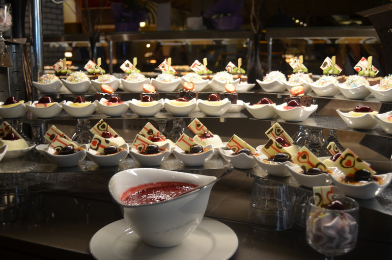 Всё вкусно приготовлено и красиво оформлено.Нету такого , что идёшь мимо километровых столов, а есть нечего. Морепродукты, салаты, холодные закуски, фрукты 7-8 видов, суши, 3-4 вида шашлыка ( баранина, индейка, курица, говядина), 2-3 вида рыбы ( в т.ч. и на гриле) На завтрак свежевыжатый сок. Десерты - вообще шедевры)