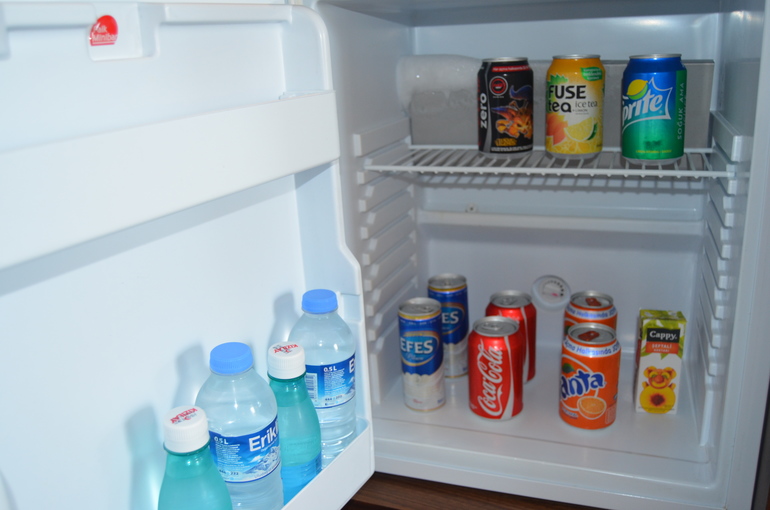 В минибаре: чай, кофе, сахар, шоколад, вода с газом, вода без газа, кола, фанта, спрайт, сок, пиво, чипсы. Пополняется ежедневно.