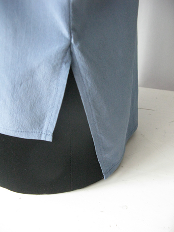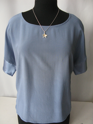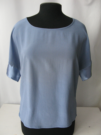Модель с цельнокроенными рукавами, со шлицами в боковых швах, пред и спинка разной длинны. Рукава декорированы атласной тканью в цвет основной.