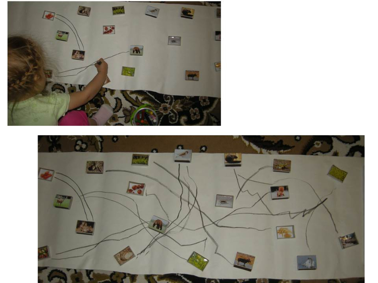 Тут началось самое интересное)) Начали искать, кто , что кушает, и Вика соединила по моему образцу, двумя линиями, потом решили одной, так как у Вики они еще далеко не параллельные)) Вот, что получилось, потом водили пальцами проводили, можно было еще машинками, но я тогда не додумала.)