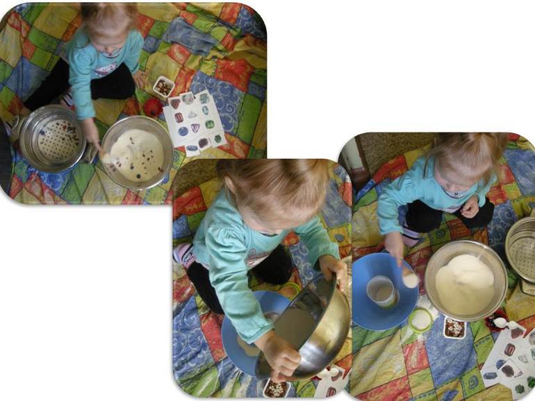 Потом вспомнили "Белоснежку" и добывали драгоценные камни среди песка и обычных камней (фасоли). Учились фасовать песок)
