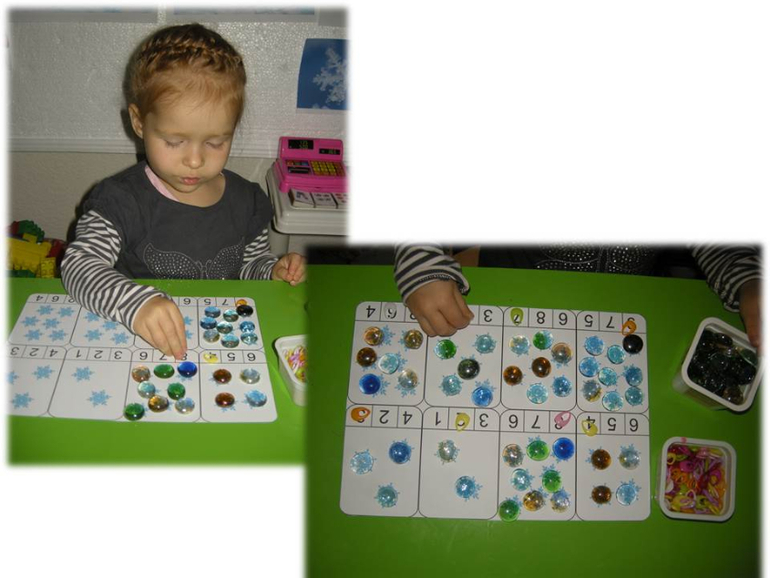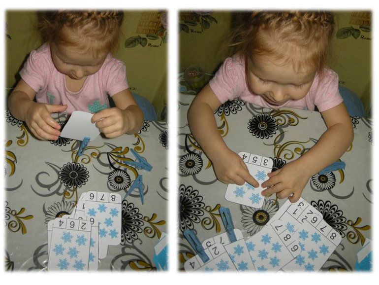 считали снежинки, так у Вики хорошо получается, когда видит, что больше нету, а если считает просто, то может по кругу начать считать.