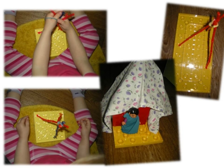Юрта в нашем исполнении) сейчас все отличается в занятиях с Викой тем, что ранее мы вместе делали, теперь в основном я делаю и Вика тоже рядом делает, но свое)) Она долго старалась скрутить резинкой палочки, но все же у нее получилось! Радовались успеху оба)) А чукча наш так вдвойне, ведь у него оказалось две юрты!))