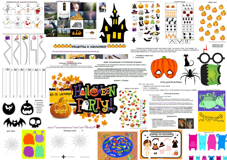 Уже три года подряд мы с доченькой Викулей весело проводим этот праздник. Моя цель была ранее весело провести время с дочкой, поиграть в тематические игры, научить ее не бояться страшных рисунков и костюмов, чтобы увидев она не ужасалась, а понимала, что это может быть и игра. Уже в том году подготовка к этой игре была отточена и я решила собрать материалы воедино в комплектик. Комплект получился объемный и думаю каждый найдет что-то для себя.