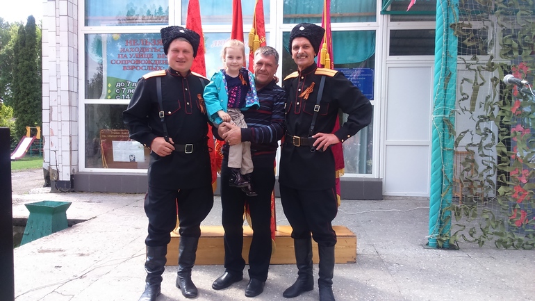 Мы ездили на папину малую родину,в Ленинградский район нашего края, посёлок Бичевой, он же совхоз Красноармеец. Так как день совпал с поминальным днем, то попали на парад сюда. Ветеранов в поселке осталось 2 или 3, из них один - папа моей крестной, тесть моего дяди родного. Был тружеником тыла. А мой дедушка уже давно нас покинул, положили цветы ему на могилку и прикрепили Георгиевскую ленточку.