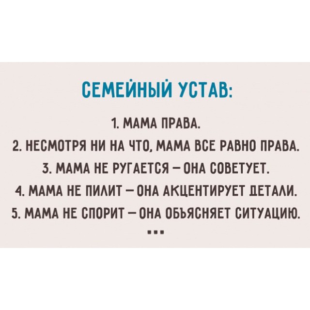 Немного юмора на тему "Мама меня учила ..." Ну, и мама, конечно, всегда права! 1⃣ Мама учила меня уважать чужой труд: «Если вы собрались переубивать друг друга, идите на улицу, я только что полы вымыла». 2⃣ Мама учила меня верить в бога:«Молись, чтоб эта гадость отстиралась!» 3⃣ Мама учила меня мыслить логично: «Потому что я так сказала, вот почему!» 4⃣ Мама учила меня думать о последствиях: «Вот вывалишься сейчас из окна, не возьму тебя с собой в магазин!» 5⃣ Мама объяснила мне причинно-следственные связи: «Если ты сейчас же не перестанешь реветь, я тебя отшлепаю». 6⃣ Мама учила меня преодолевать невозможное: «Закрой рот и ешь суп!» 7⃣ Мама научила меня выносливости: «Не выйдешь из-за стола, пока все не доешь!» 8⃣ Мама учила меня смело смотреть в будущее: «Уж, погоди, дома я с тобой поговорю!» 9⃣ Мама научила меня основам самолечения: «Если не перестанешь косить глазами, на всю жизнь таким останешься». Мама учила меня быть гибким: «Посмотри, какая у тебя шея сзади грязная!»