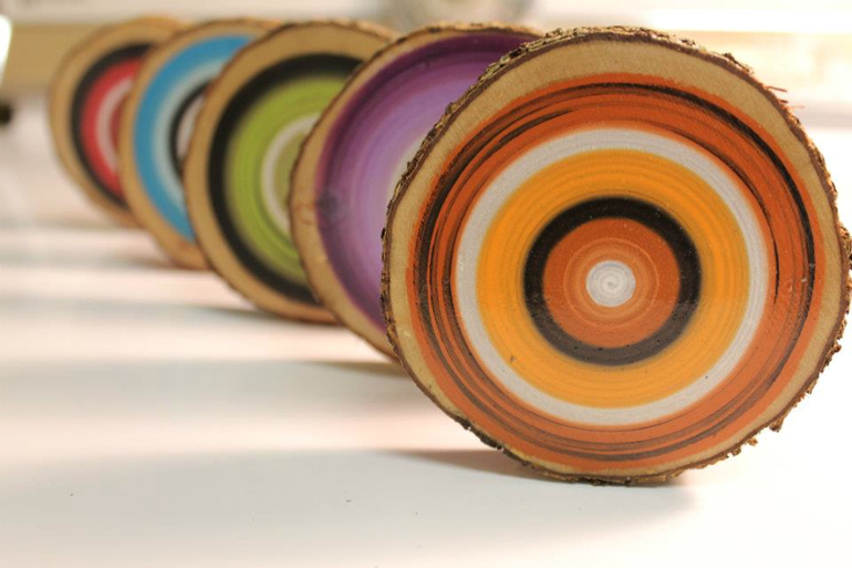 Венди Коре (Wendy Kaehr) создает уют домашнегшо декора и дарит солнечное настроение с помощью разноцветных колец из дерева. Необычный предмет интерьера он изготавливает из дерева и покрывает соевыми и акриловыми красками. По-настоящему радует глаз))