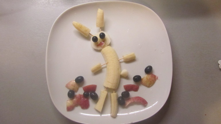 Ежика сделать не успели, а вот зайчик из банана, яблока и винограда с отрезками из зубочисток получился )