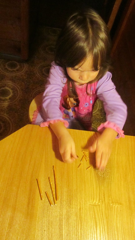 Для начала я познакомила Софию с понятием "отрезок" - разломала соленые палочки на разные по размеру. София ими с удовольствием полакомилась.