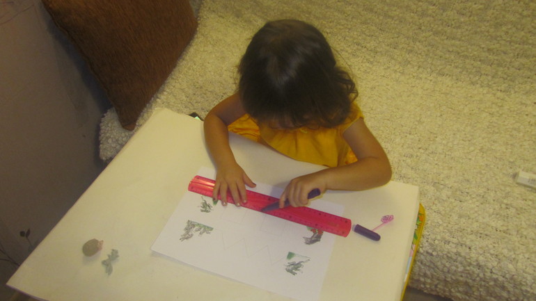 Вечером мы тренировались рисовать отрезки по линейке и обсуждали понятия "вертикально и горизонтально".