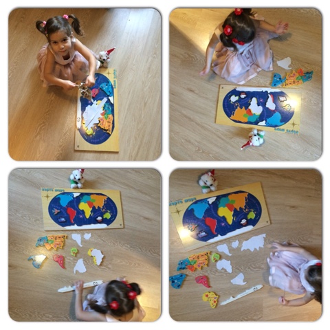 Для начала рассмотрели нашу деревянную карту-вкладыш. Я подготовила картонные континенты такого же размера. София подбирала пары.