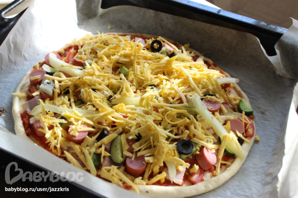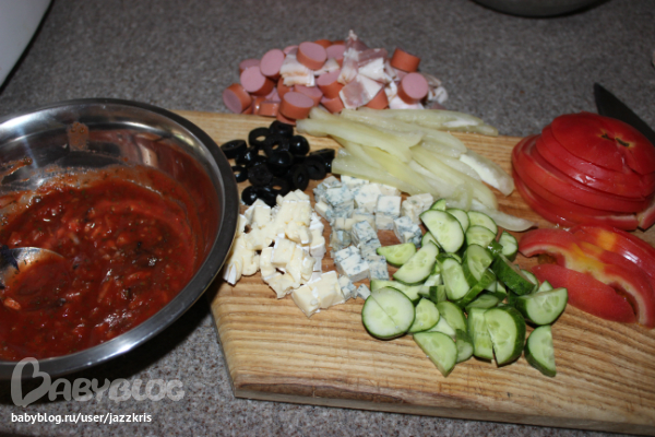 В качестве начинки у меня: сосиски, бекон, маслины, сыр бор-блю, сыр бри, помидоры, болгарский перец, соленые огурцы и российский сыр для посыпки
