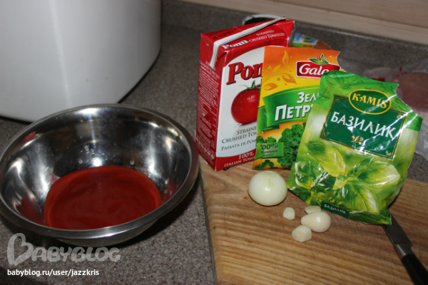 Берем томаты в собственном соку (красный пакет на фото), они уже взбитые.
