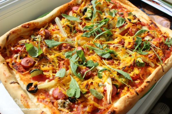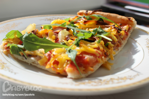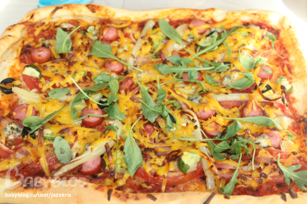 Потом когда пицца слегка остынет можно украсить рукколой.