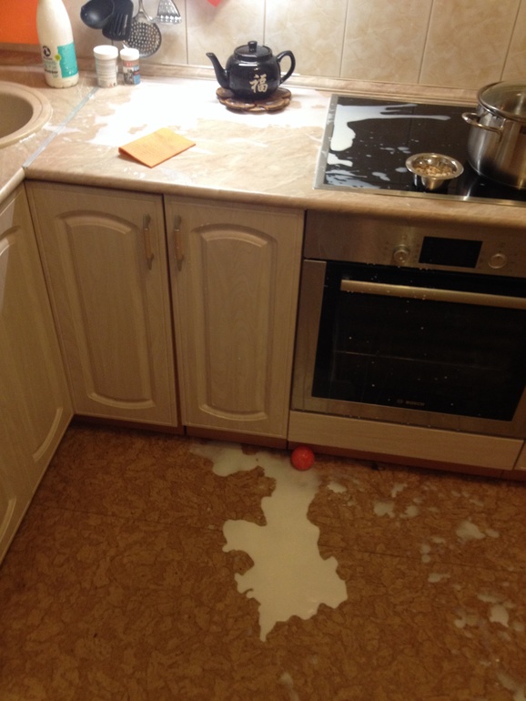 Ага, оставишь, как же... Чарли тут де нырнул в лужу и стал радостно спешно ее пить. А ему нельзя молоко, еще и то которое за трое суток в тепле не скисло. Пришлось закрыться от него и убирать... А он лрал так, будто я лапу у него отрезала...