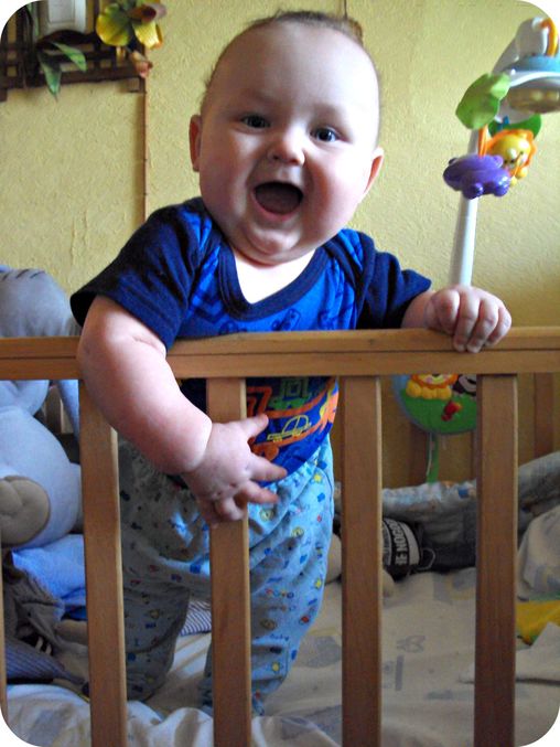 Ползает и встаёт в кроватке держась за перила. Говорит "ДАЙДАЙ!" И тянет ручки ко мне) Играет в ладушки.