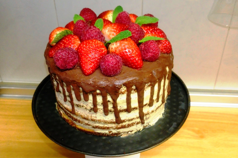 Эксперимент с коржами из сгущенки "молочная девочка" и кремом из маскапоне удался - вкусно. А вот шоколадные потеки не очень вышли: