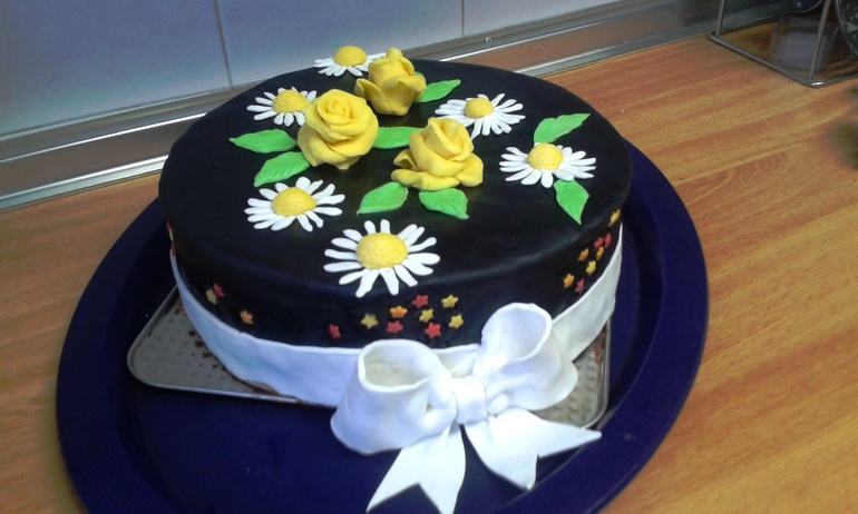 Второй сделала здесь, в Испании, когда пригласили в гости друзья. Белые коржи, кофейная пропитка, шоколадный крем. Попробовала вылепить розочки и бант: