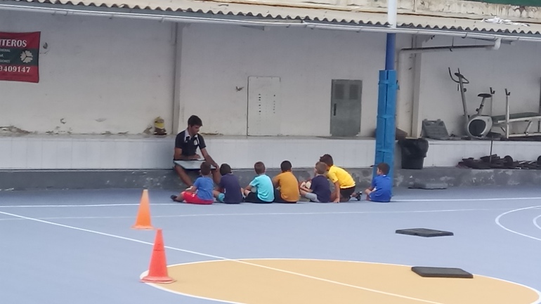 Испанские дома построены обычно с закрытым внутренним двором в середине. И вот в одном из таких дворов в центре города оказалась отличная баскетбольная площадка и юношеский клуб. Тренер сказал нам, чтобы мы пришли на полчаса раньше, чтобы познакомиться с детьми. Тренер, кстати, несмотря на молодость, прекрасно умеет общаться с детьми, очень весело и задорно, все время шутит и часто их хвалит и подбадривает. Сначала малтчишки получили по мячу и начали пытаться забросить мяч в кольцо: