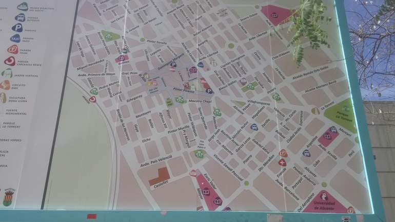 Карта на щите на остановке трама) Мы прогулялись от нижнего зеленого треугольника справа (парк Ло Торрент) до верхнего зеленого слева (Хуан XXIII), маршрут меньше чем на 2 км) люблю небольшие городки.