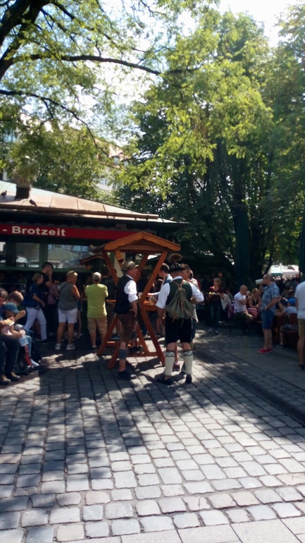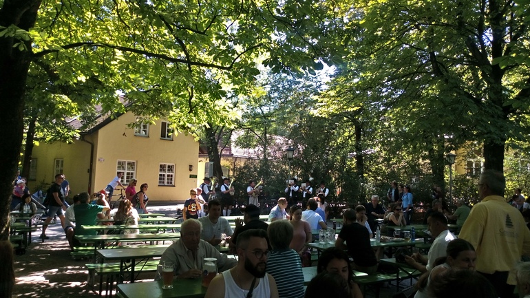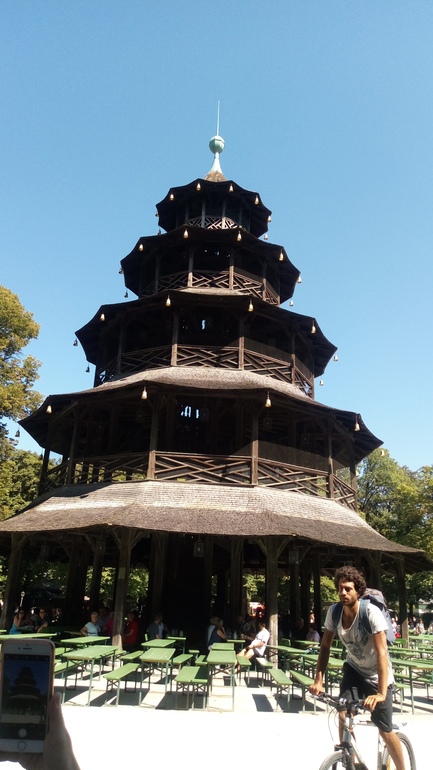 Вокруг Китайской башни расположен Пивной сад - Биргартен на 7 тысяч посадочных мест, второйв Мюнхене по величине. И мы посидели там, борясь с осами и слушая духовой оркестр, игравший с Китайской башни баварские марши.